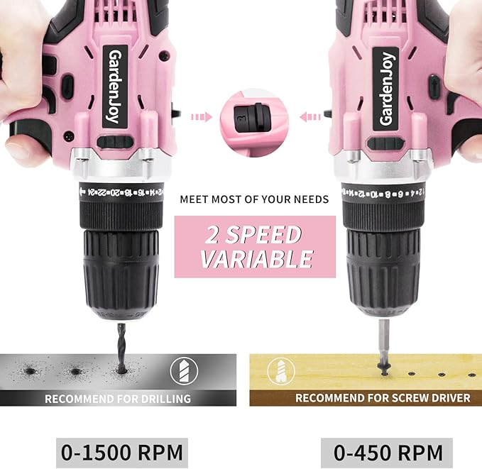 - 【24+1 Position Clutch & 2-Speed Settings】 24+1 torque settings and 2-Speed( ( 0-450 & 0-1500 RPM ) of power drill can provide more precise torque or speed adjustment as required, which helps to prevent sinking a screw too deep, stripping out the head of a screw or even breaking a screw shaft.