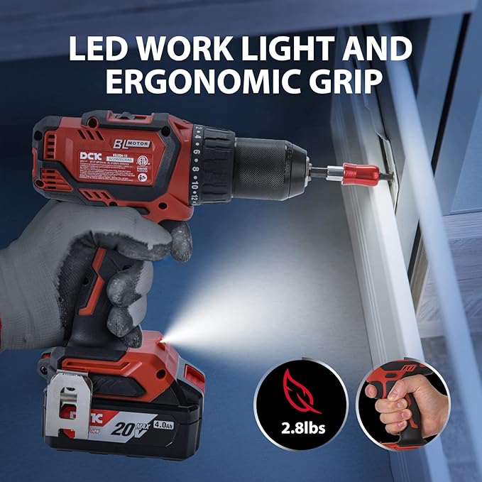 DCK Brushless Cordless Drill Set, 20V Max Electric Drill with 4.0Ah Battery 531in.lbs, 1/2Inch Keyless All-Metal Chuck, 2 Variable Speeds, Power Drill Kit for Screw Wood/Ceramic/Tile/Steel KDJZ04-13