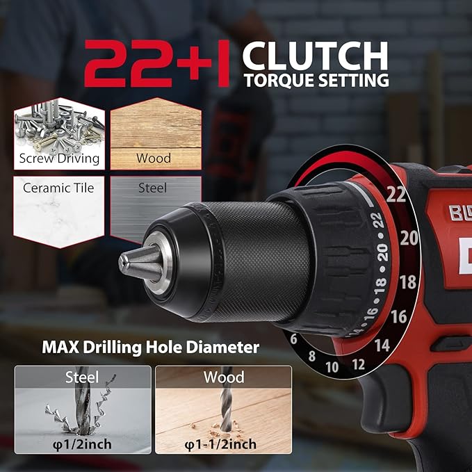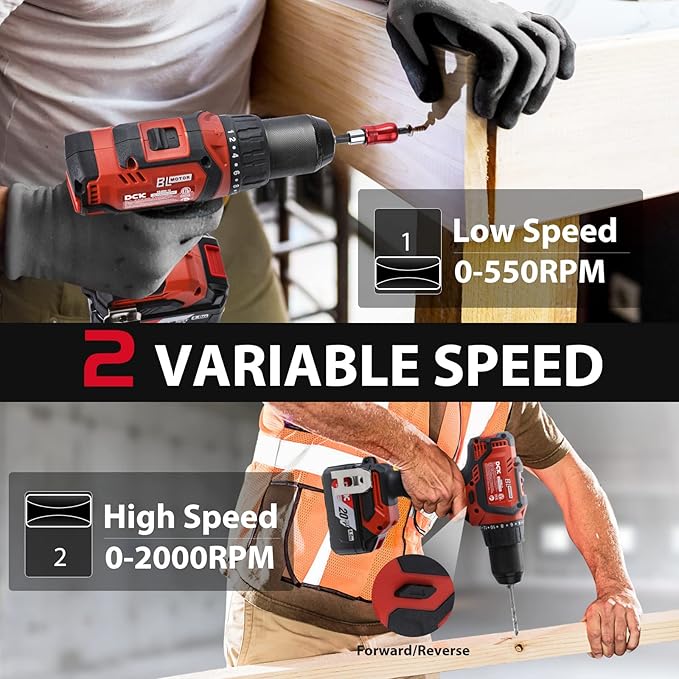 - [2 Variable Speeds and 22+1 Torque Setting] Variable speed trigger controls 2 speeds, 0-550/0-2000 RPM. The reverse switch on the body of the cordless drill set allows for forward and reverse operation. 22+1 torque setting of our electric drill can provide more precise torque, drilling into wood, ceramic, or even metal easily (Drilling Capacity: Steel φ1/2inch Wood φ1-1/2inch). Its various torque options keep you from screwing in too deep, and ruining the screw.