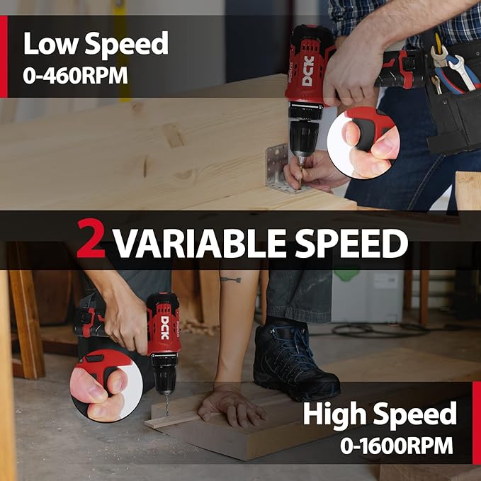 - [2 Variable Speeds and 20+1 Torque Settings] Equipped with a 2-in-1 working mode - driving and drilling, the DCK 12V Cordless Drill with 20+1 adjustable clutch settings and variable pressure triggers (2-speed: 0-460 RPM,0-1600 RPM) complete a wide range of applications precisely (Drilling Capacity: Steel φ3/8- inch Wood φ25/32 inch). This magnificent drill works for any type of maintenance work. So the DCK cordless drill is the most useful tool that cannot be missing at home!