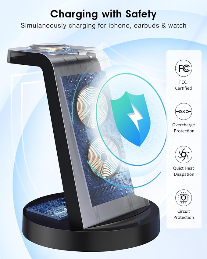 - 【Safety Fast Charging】Equipped with A 18W fast charger and 3.3ft type-c charging cable, enable fully charge in just 2 to 3 hours,get a boosted at 30% faster than other iphone wireless charger. Besides,with advanced FCC approval,our 3 in 1 charging station uses the latest chip to boost efficiency and improve heat dissipation,and provides temperature control and voltage protection,and short-circuit prevention.There are cooling holes on the back,no need to worry it gets extremely hot.