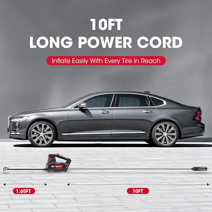 - LED LIGHTING FOR NIGHT TIME:To be a proper solution for night time inflating job, the electric air pump comes with a SUPER LED-lighting(Contains 16 LAMP Beads)feature to support your inflating needs in low-light environment. Coupled with the 10ft power cord, both of the front and the rear tires will be fully taken care of with less efforts as it eliminates the unnecessary hassles of unplugging the appliance every time you switch from one tire to the other.