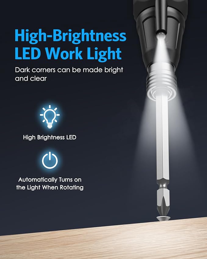 - Built-In Led Light and Usb Charging: The cordless screwdriver includes a built-in LED work light and rechargeable battery; The auto-on LED light illuminates small dark areas in corners; In addition, this cordless screwdriver supports USB charging; It can work continuously for 40 minutes after 1 hour of charging
