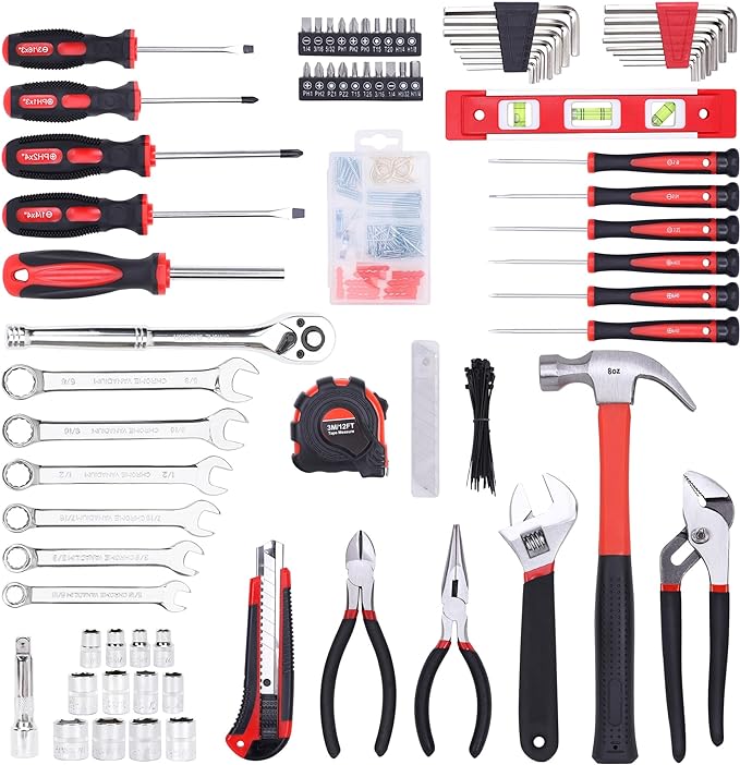 - Includes pliers, adjustable wrench, hammer, screwdrivers, magnetic screwdriver holder, screwdriver bits, utility knife, tape measure, sockets, combination wrenches, hex keys etc. Perfect for your home use or gifts