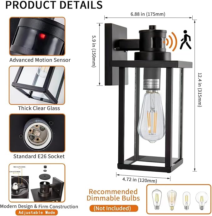 - 【Easy Installation and Standard E26 Socket】Motion sensor Wall lanterns sconce well attached all installation accessories and a detailed manual, Just follow the steps in the instructions, will easily install and illuminate the outdoor motion light perfectly. With considerate opened bottom design makes it easy to replace the bulb and clean the glass without removing the lamp. Hard wired, Included all mounting hardware for quick and easy installation. Requires 1 x E26 base 60W bulb(incandescent, LED, or CFL)per light. The bulb is not included.