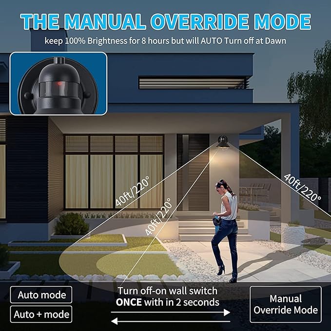 - 【Manual Override Lighting Mode】In order to make the motion sensor porch light fixture suitable for more scenes, we have added an additional 8-hour constant light mode, Just turn the wall switch “off-on” with 0.5~2sec. to shift to manual mode from auto one, keeping 100% brightness at night, but will auto turn off at dawn.