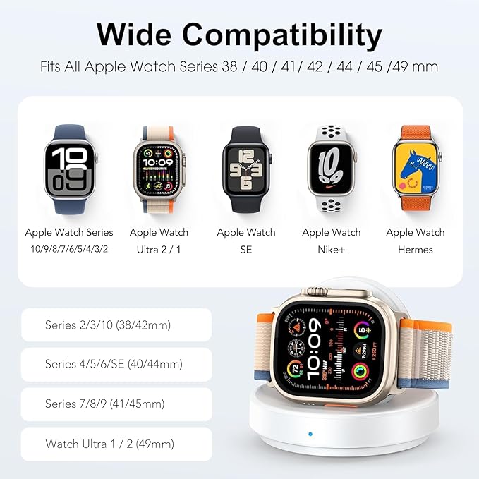- Compatible with All Apple Watch Models: Charging stand compatible for Apple Watch Series 10/9/8/7/SE/6/5/4/3/2 (includes 38mm 40mm 41mm 42mm 44mm 45mm version), Apple Watch Sport, Apple Watch Nike Plus, Apple Watch Hermes, and Apple Watch Edition. (Note: Not support series 1)