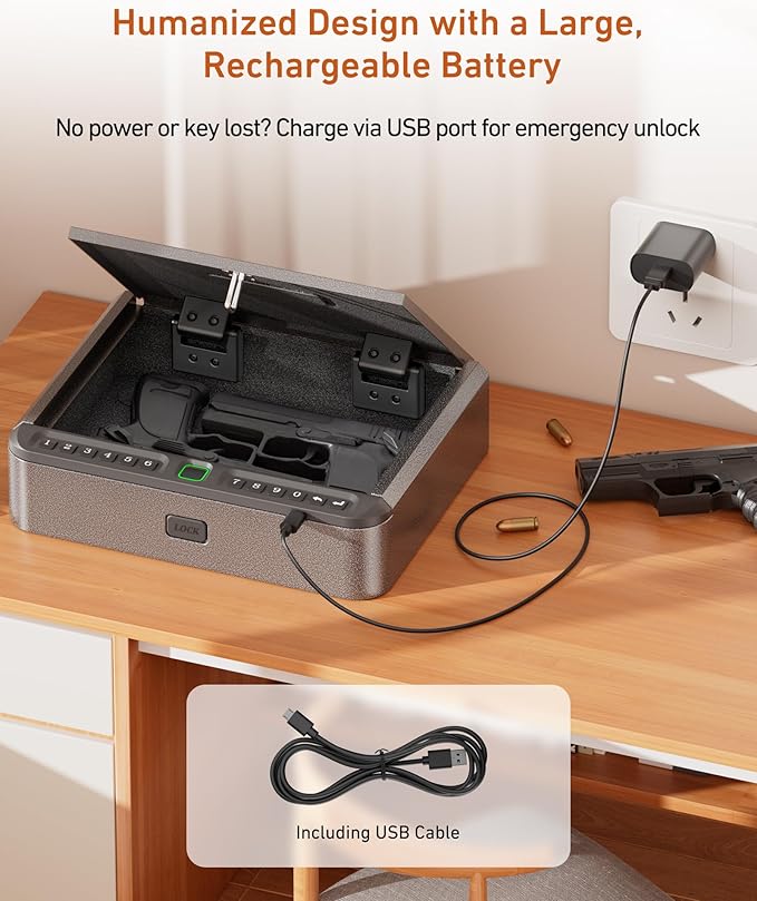 - USB Charging & Mute: The handgun safe has a 1800mAh large-capacity battery and a low-power consumption chip. It has an external USB charging port, which can be charged anytime, and has a low battery reminder function, so you don’t have to worry about battery power! Fingerprint safe also has a silent function and a user-friendly design, and you can also switch to silent mode according to your preference. A pistol safe with LED lighting makes picking up and placing items in the dark easier