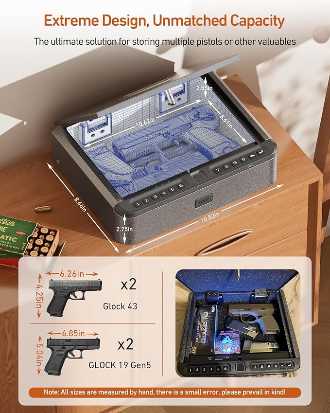 - Portable & Spacious Capacity: This fingerprint gun safe can easily store 1-large handguns, or 2-standard-size handguns, plus other valuables like jewelry. The handgun safe adopts a compact size design, making the exterior size only 10.82"*8.66"*2.75" and the interior size as high as 10.62"*5.84"*2.55"; smart small safe, which is also perfect to put in your car, drawer, nightstand, etc., easy to carry. Keep your guns away from children, and gun safes protect your family and yourself anytime