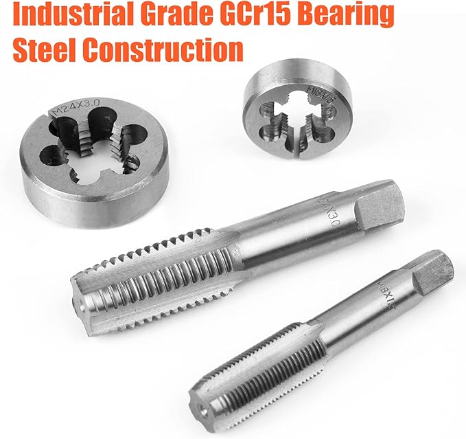 - 【WIDE APPLICATION】: Our metric die and tap sets are perfect for threading and rethreading, creating new threads and repairing worn-out threads on stainless steel, carbon steel, copper, brass, aluminum, cast iron, and wood in many fields, and are easy for you to use.