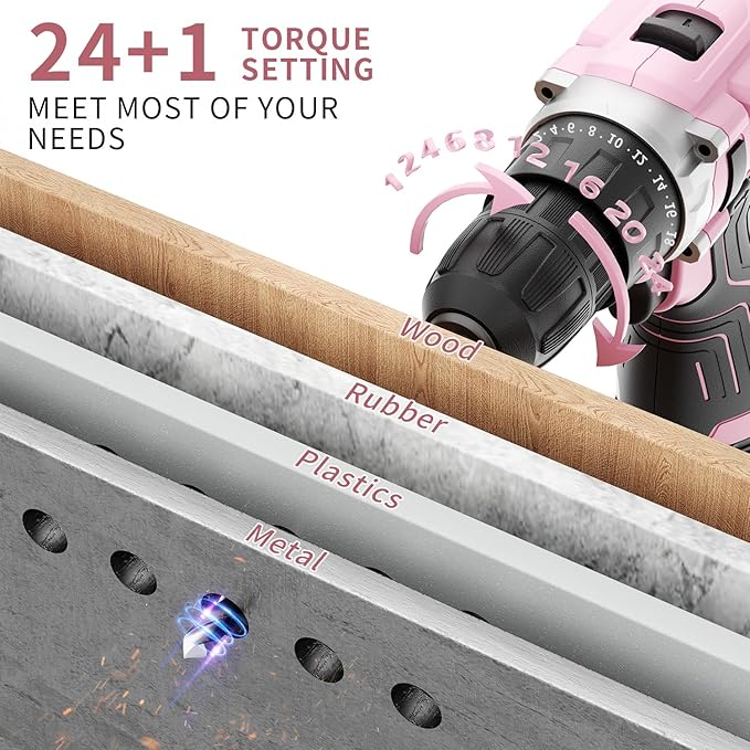 - 【24+1 Position Clutch & 2-Speed Settings】 24+1 torque settings and 2-Speed( ( 0-450 & 0-1500 RPM ) of power drill can provide more precise torque or speed adjustment as required, which helps to prevent sinking a screw too deep, stripping out the head of a screw or even breaking a screw shaft.