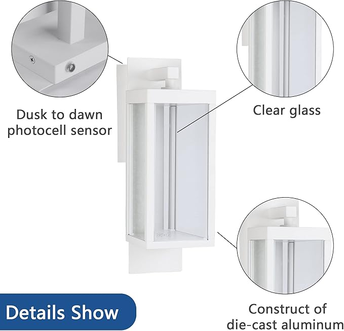 - Dusk to dawn sensor: Outdoor wall lantern with photocell sensor,It can sensitively detect the surrounding brightness to adjust the switch.Automatically lights up at night, and turns off at dawn.More energy efficient and more convenient