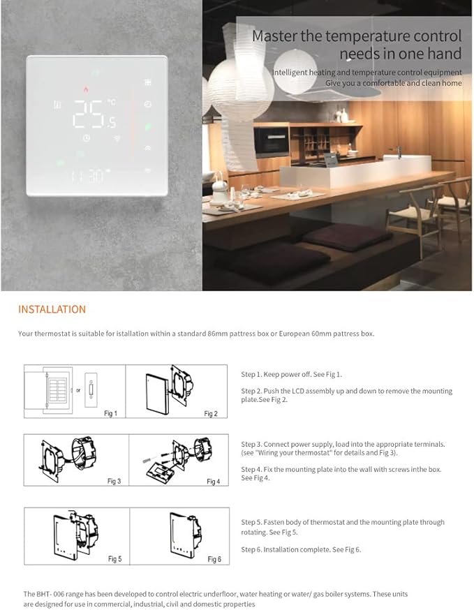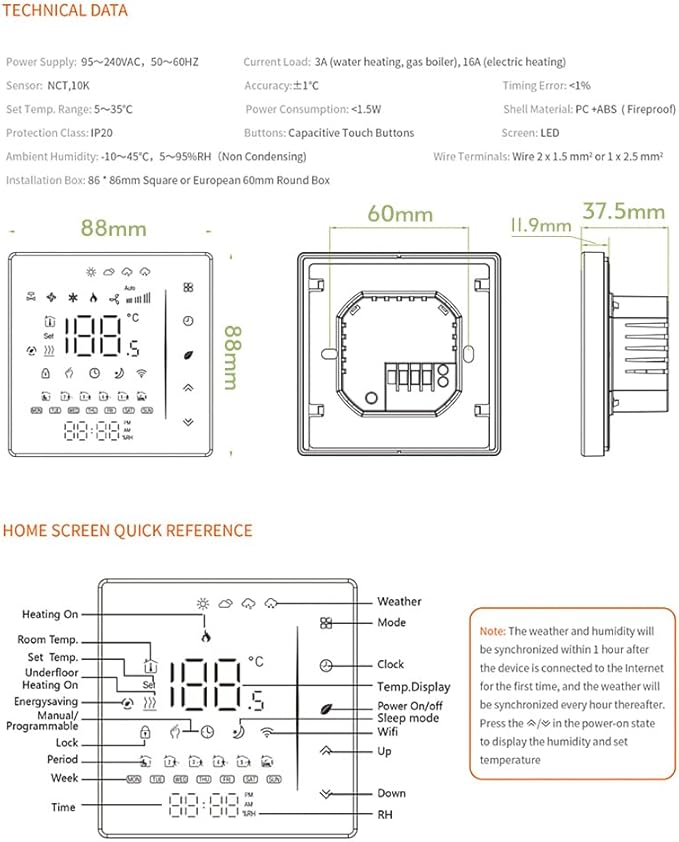 - 【WiFi Smart Thermostat】This WiFi smart thermostat with LCD display adopts ultra-thin wall-mounted body and touch operation buttons design, easy to install and simple to use. Compatible with standard 86mm square cassettes and 60mm European cassettes.