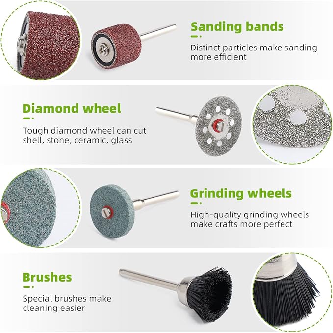 - 510Pcs Rotary Tool Accessories: Huepar Tools 510Pcs 1/8"(3.2mm) quality accessories include sanding shanks, sanding bands, cutting wheels, grinding wheels, HSS cutter, flap wheel, brass brushes, steel wire brushes, mandrel, 4pcs collet, and wrench, etc. Very suitable for sanding, polishing, cutting, grinding, engraving, sharpening, drilling, cleaning, carving, etc. Meet your various application requirements. For processing or DIY of wood, glass, tiles, plastic, metal, etc