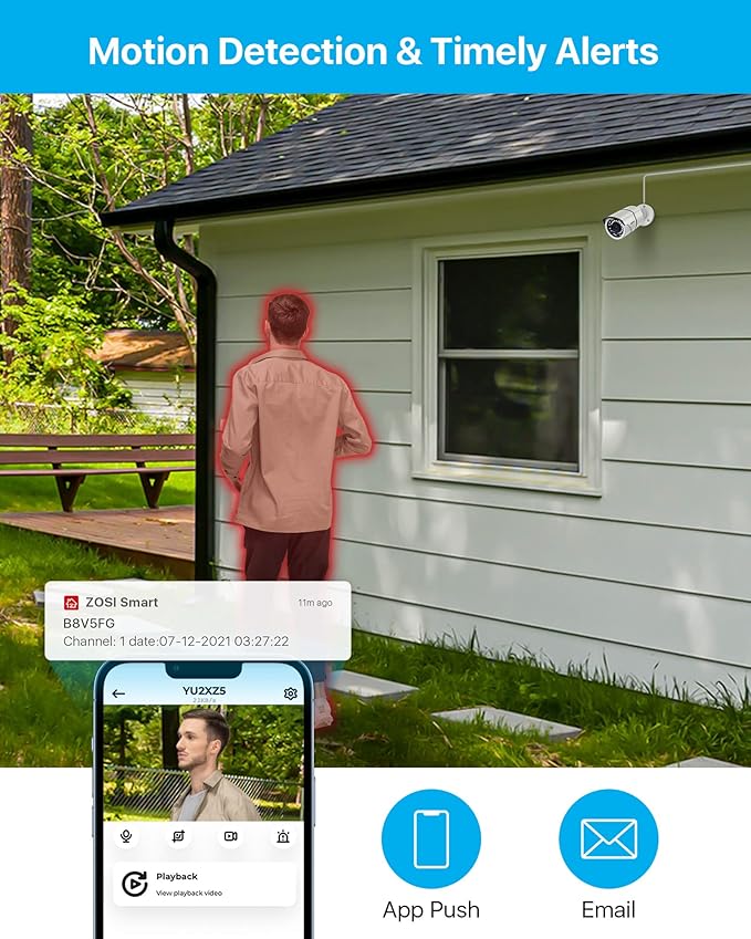 - 【Remote Access & Motion Detection & Instant alerts】 Free app for live view & Playback on Mobile Phone with Wi-Fi anywhere anytime.You can customize a specific motion detection zone in each camera to minimize false alerts.