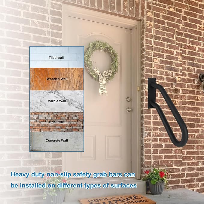 - 【EASY INSTALLATION】Quickly install the handrail, fix the handrail where you want to install, make a mark, drill holes in the mounting surface, fix the mounting position of the base, tighten it with screws, and it only takes a few minutes to complete the installation.