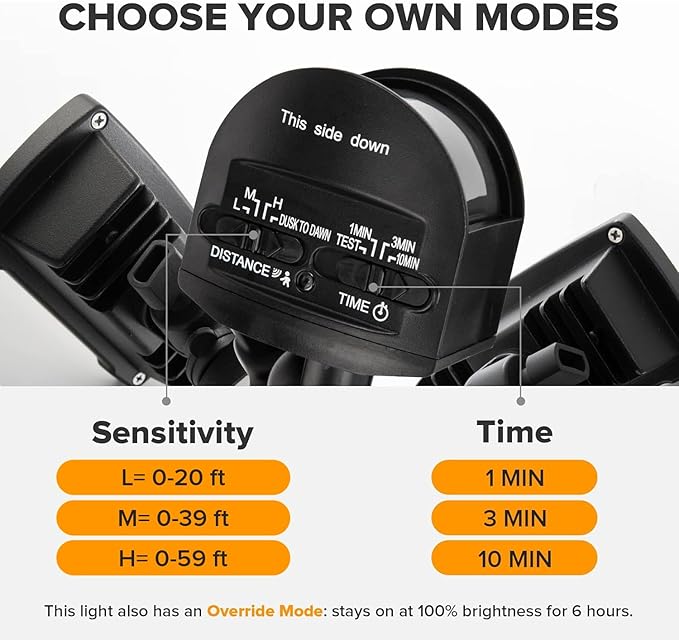 - 【4 LIGHTING MODES】Test Mode, Security Mode, Dusk to Dawn Mode and Manual Override Mode. Manual override mode allows light to operate constantly for selected period of time. More choices can meet different demand for each customer. Choose the most appropriate mode for your needs and desires.