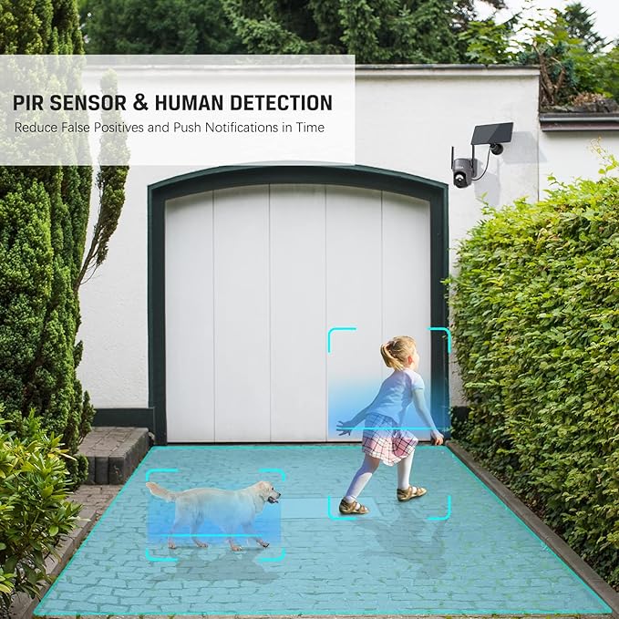 - 【Smart Detection and 2-Way Talk】The smart home security camera features an updated PIR motion sensor and AI algorithms, supports smart human/animal detection. Once triggered, the security camera will auto record event, push a real-time app notification. You could turn on the spotlight or sound to make an alarm via the APP, talk and alerts uninvited guest with built-in mic and speaker.