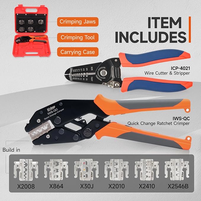 - 8PCS ALL-IN-ON TOOLSET:1pc ratchet crimper, 6 pairs of quick-change jaws, and 1 wire stripper & cutter are packed in a durable storage case. This set is ideal for electricians, DIYers, mechanics, and more.