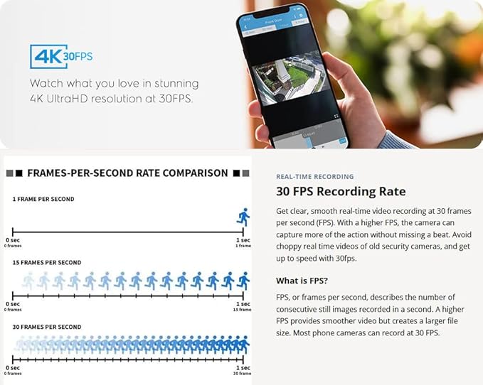 - 12MP @30 FPS Recording Rate - Get clear, smooth real-time video recording at 30 frames per second (FPS). With a higher FPS, the camera can capture more of the action without missing a beat. Avoid choppy real time videos of old security cameras, and get up to speed with 30fps.