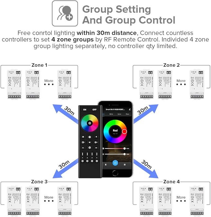 - 【Suitable For The Project】1.Multi zone control,Multiple controllers required. 2.Need 2.4GHz RF Remote or TuyaSmart SmartLife APP WiFi Control. 3. No need Bluetooth or WiFi. 4.Need Alexa or Google home third party voice control. 5.Cost effective LED project.