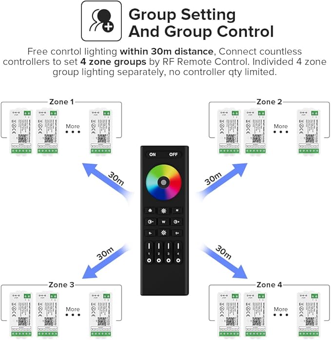 - 【Suitable For The Project】1.Multi zone control,Multiple controllers required. 2.Need 2.4GHz RF Remote or TuyaSmart SmartLife APP WiFi Control. 3. No need Bluetooth or WiFi. 4.Need Alexa or Google home third party voice control. 5.Cost effective LED project.