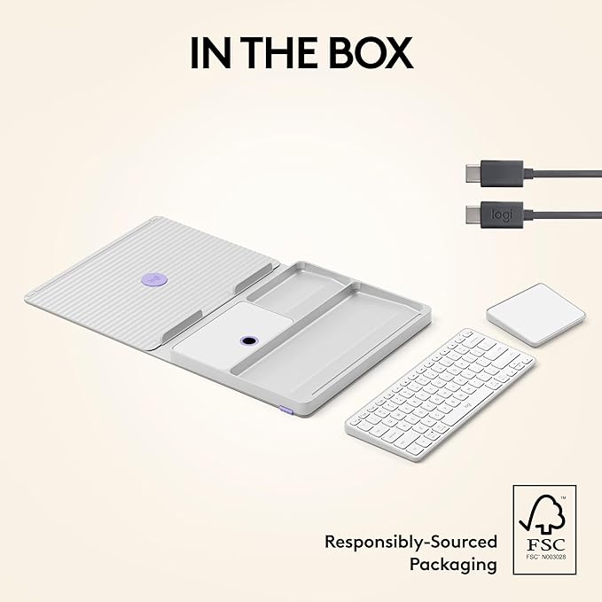 Logitech Casa Pop Up Desk Kit - Adjustable Laptop Stand for Desk, Wireless Keyboard & Touchpad, Bluetooth, USB C Charging, Nordic Calm, Tan/Purpl