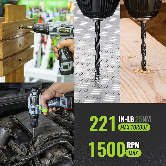 WORKPRO Home Tool Kit with Power Drill, 108PCS Power Home Tool Set with 12V 1.5 Ah Battery Powered Screwdriver and Tool Box, Electric Cordless Drill Set with Keyless Chuck and Variable Speed Trigger