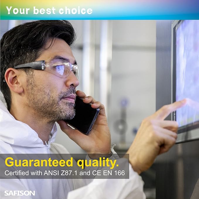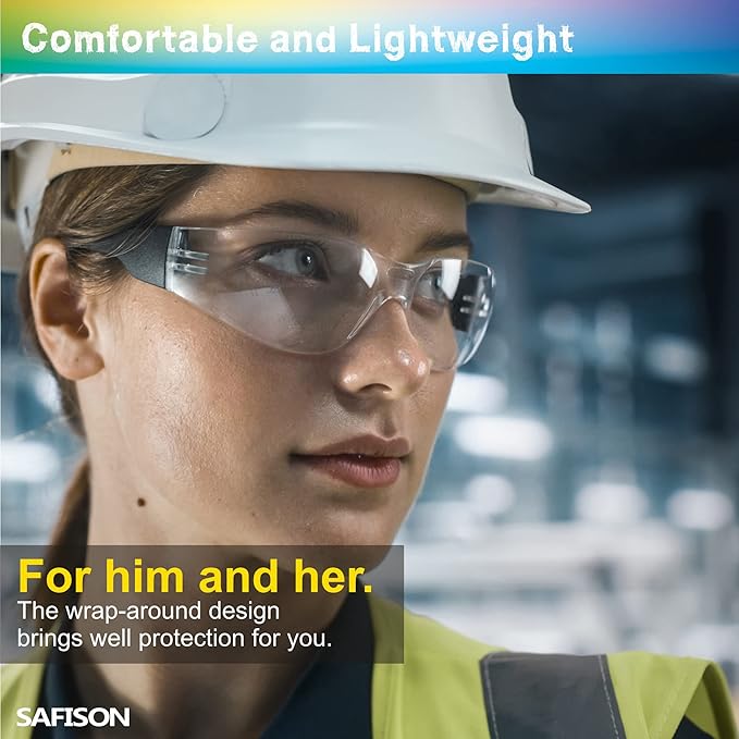 - 【INDUSTRIAL GRADE PROTECTION】SAFISON eye protection are made of high quality polycarbonate material with clear lenses that meets ANSI Z87.1+ and EN 166 standards. Providing 99.9% protection against glare and UVA/UVA/UVB rays.