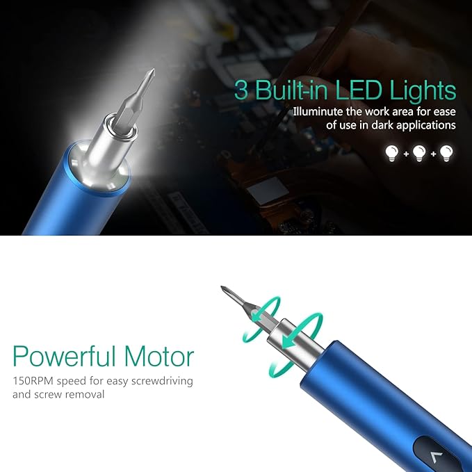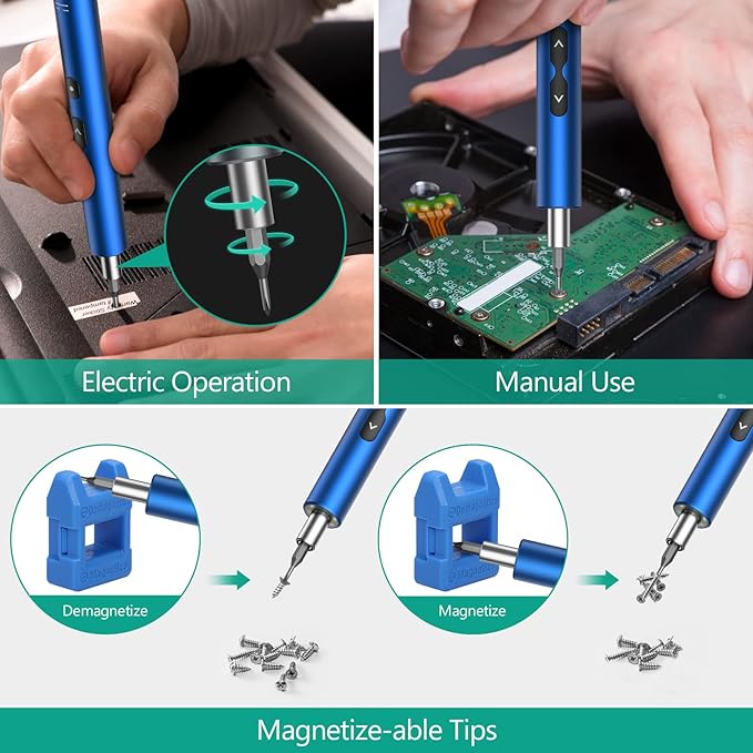 - Electric Handle Design: The electric screwdriver kit comes with an electric handle, which can make your work efficiently and quickly, saving you time. The output torque: 0.25-0.35 N.M, low running sound.