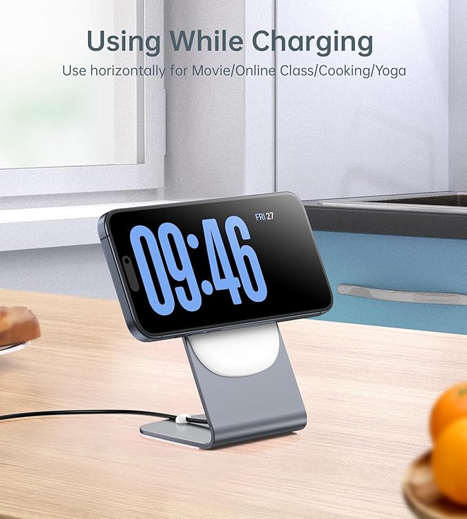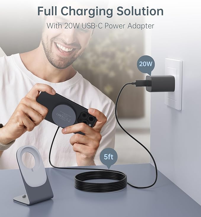 - 【Magnetic Wireless Charger + USB-C PD 20W Charger + Aluminum Charging Stand】Complete Charging Solution in one item. Includes USB-C 20W Charger and Aluminum Stand with removable Mag Charger. It’s what you need to charge for iPhone 16,15,14,13 and 12 Series.【Hot Tips】① The USB-C PD 20W Charger offers 20W for wired charging.②This desk stand fits our proprietary charging pad Only (Not for Original Apple Mag Charger or any other brands).