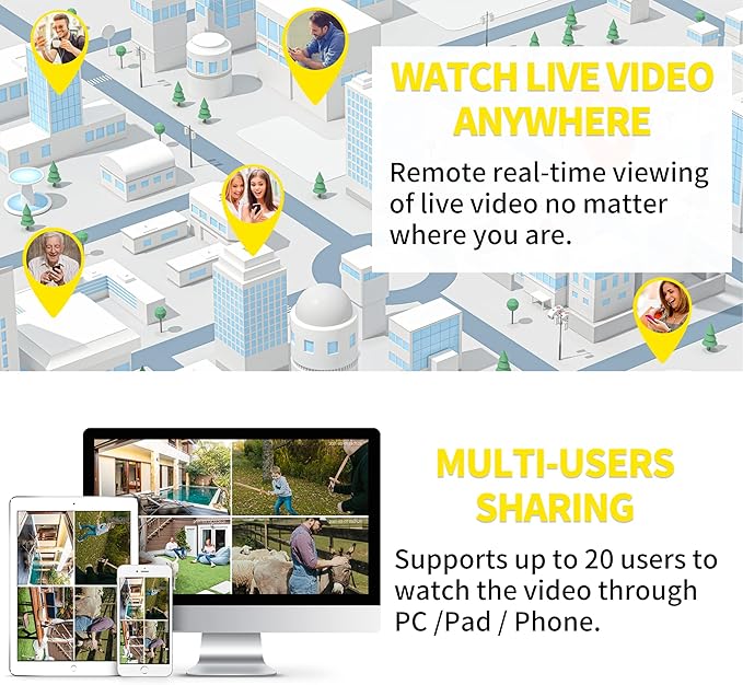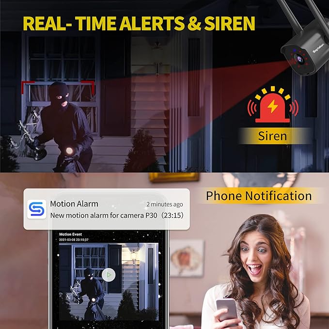 - 【Alarm Siren & Multi-user Access】You can set the camera's automatic siren or sound the siren in case of emergency to scare away uninvited guests. Share the outdoor camera with your family (up to 8 users), protect your home together. Supports RTSP, Onvif and compatible with Alexa.