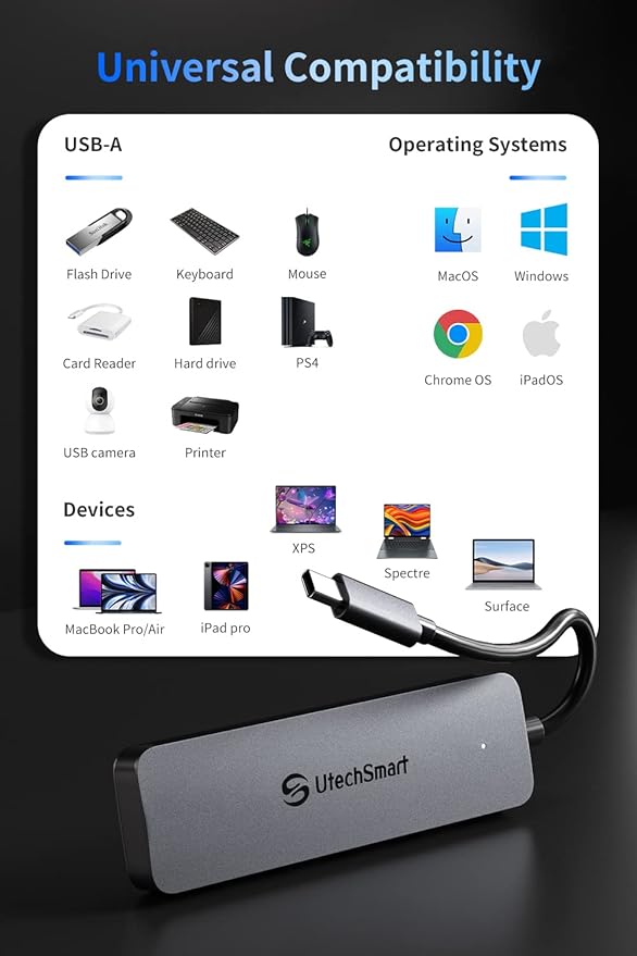 UtechSmart USB Hub, 4-Port USB 3.0 Hub, Ultra-Slim USB Adapter for Laptop, 5Gbps Fast Data Transfer, USB 3.0 Splitter for Dell, HP, MacBook (Grey)