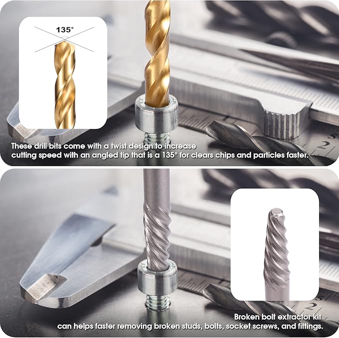- Remarkable Quality- The drill bits of this extractor set are made of high-speed steel, which are harder, expensive, and hold a high temperature. Flutes form helps clear chips and debris away from the bit, decreasing friction and heat for a faster, cooler drilling process.135° Split Point with straight shank prevents walking and makes drilling precise.