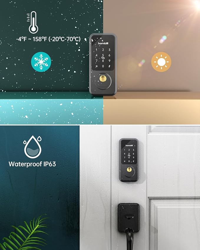 - 【Build to Last】After Multiple tests, hornbill Smart Front Door Lock Set can operate well under -4 °F-158 °F (-20℃-70℃) with an IP63 Waterproof Level. Feature Shock Resistance + Anti-Peep OLED Keypad + Heavy Duty Alloy + Long Battery Using Time (Approx 20000+ times Lock/Unlock).