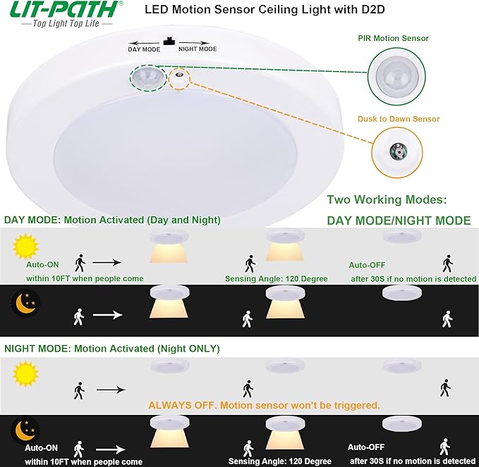 - MOTION ACTIVATED: The LED ceiling light is motion activated. Auto-on within 10 feet when people come, auto-off after 30 seconds if no motion is detected. Sensing Angle: 120 Degree