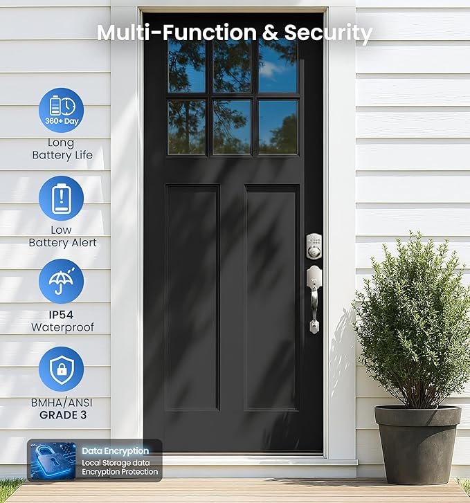- Security Locking: "Smart Door Locking" – The door lock auto-locks in 10-99 seconds. Press and hold any key for 2 seconds to activate "One-touch Lock." The rotatable knob allows for locking/unlocking in 1 second from the inside