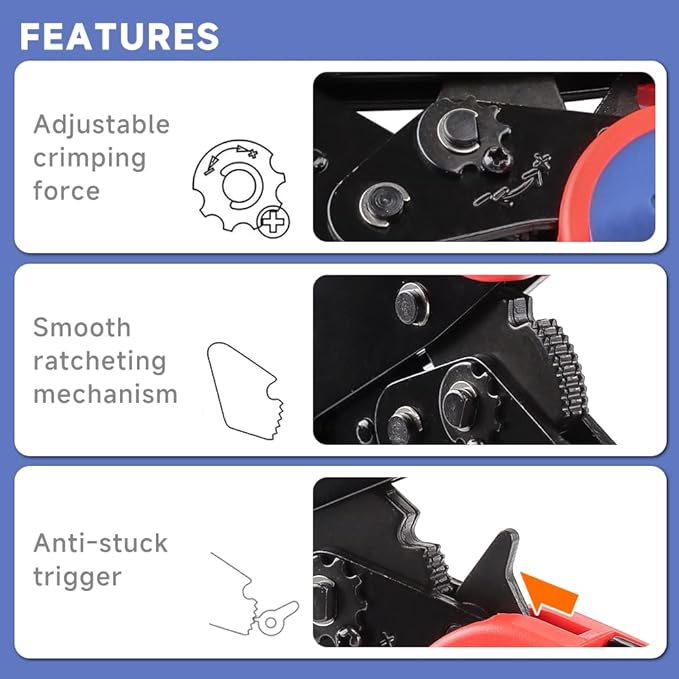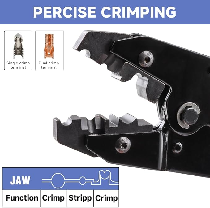 - Precise Mechanics - The crimping process is accomplished by pressing the handle through a complete ratcheting cycle until the handle is automatically released. Due to the ratchet, you are able to secure the connector first and then insert the wire into the crimp.