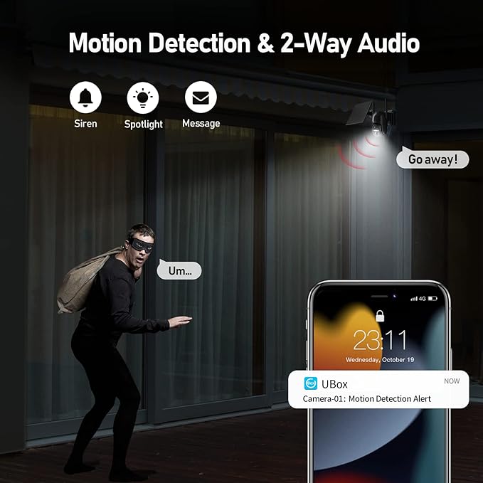 - 【2K Color Night Vision & 360° View】Via the Ubox App, this cellular camera offers 2K high resolution with 4X digital zoom. The wide-angle lens supports both horizontal and vertical rotation, providing a broader and more flexible viewing angle. Even in the dark, the full-color night vision allows you to keep an eye on your assets at all times. (The spotlight needs to be manually enabled in the App.)