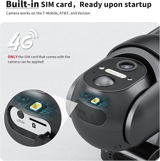 - 【Built-in SIM & 32GB Memory Card】Includes an EIOTCLUB 4G LTE SIM card (U.S. only; AT&T, T-Mobile, Verizon) with a 7-day unlimited trial. Only the built-in SIM supports operation; after the trial, a subscription must be made ($19.9/month–$169.9/year) to continue cellular service. Please ensure the installation site has 4G coverage. Comes with a 32GB memory card (supports up to 128GB) and a 30-day cloud trial.