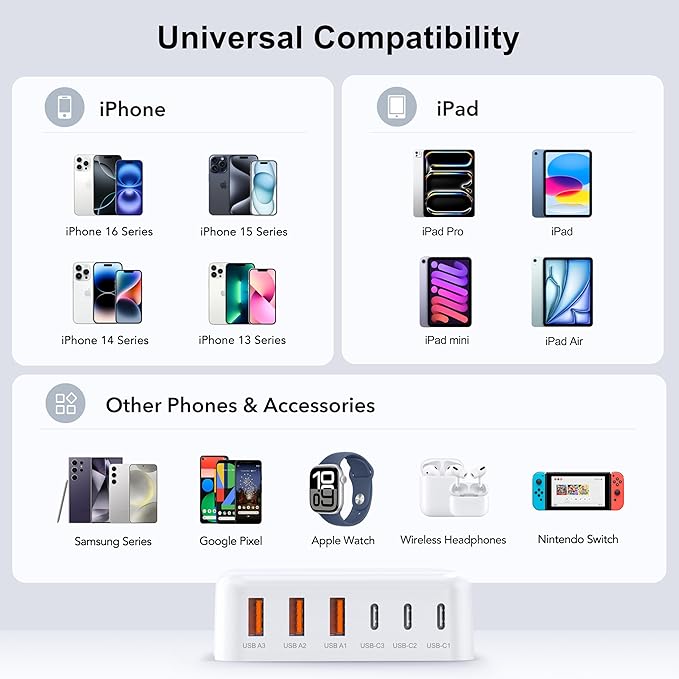 - ⚡【Fast-Speed Desktop Charging Station】Only 30 minutes, charge your phone to 60%. 6 in 1 Charging blocks with 3 x USB C PD 3.0 port (20W max), 3 x USB port(18W max), this charger supports a maximum output of 100 watt in total. No need to wait, it can charge your watch, earphone, mobile phone, fan and other 6 different devices at the same time.