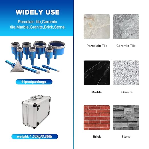 - Wide Applications --Diamond core bits are worked great for dry drilling holes through hard porcelain tile, ceramics,bathroom tile,granite & marble, masonry, concrete, glass, hard plastic with ease. Using water could prolong the lifetime