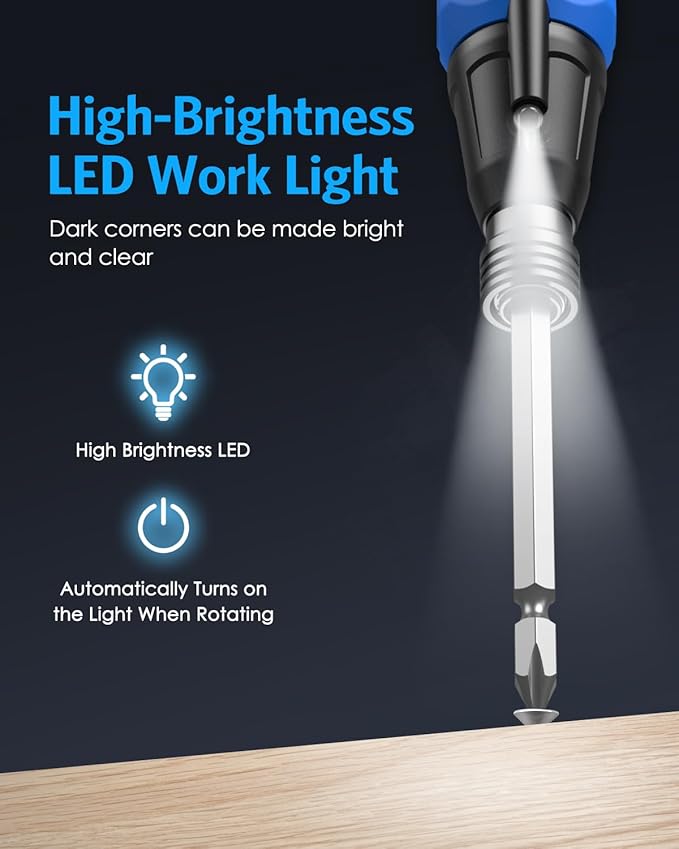 - Built-In Led Light and Usb Charging: The cordless screwdriver includes a built-in LED work light and rechargeable battery; The auto-on LED light illuminates small dark areas in corners; In addition, this cordless screwdriver supports USB charging; It can work continuously for 40 minutes after 1 hour of charging