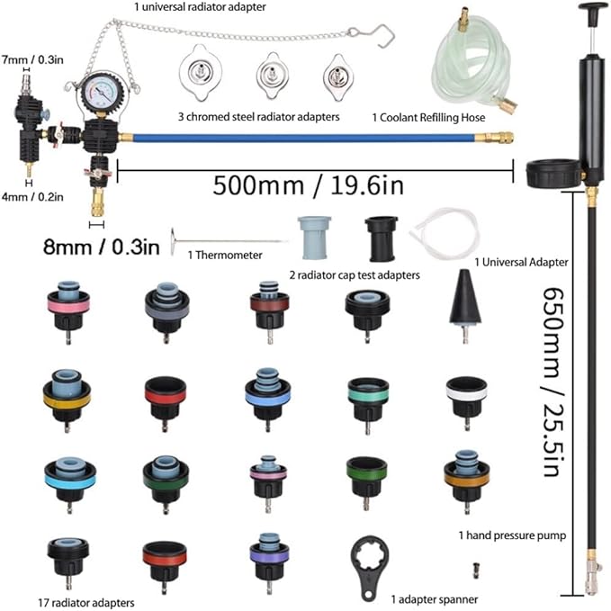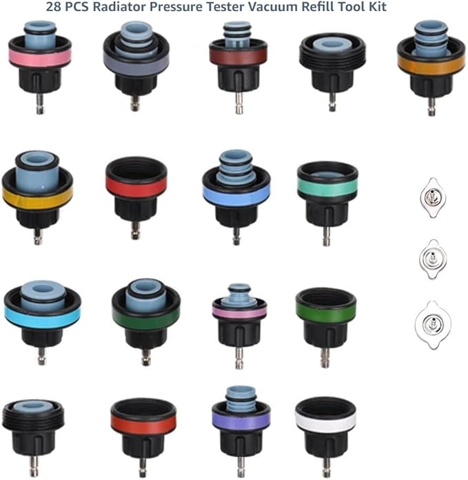 - 【28pcs coolant pressure tester with coolant refill tool】:28pcs Universal Radiator Pressure Tester and Vacuum Type Cooling System Kit,The items are the same as the pictures.We provide carefree return, Our aim at pursuing the maximum satisfaction of our buyers!