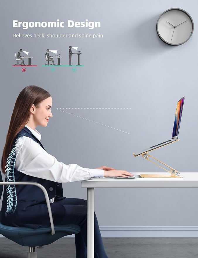 - Ergonomic Design: The MacBook air pro stand holder works as a raiser to elevate the laptop screen to your eye level. The office computer stand let you fix posture and relieves neck, shoulder and spinal pain, it's very comfortable for working at home, office and outdoor, make typing more easier.