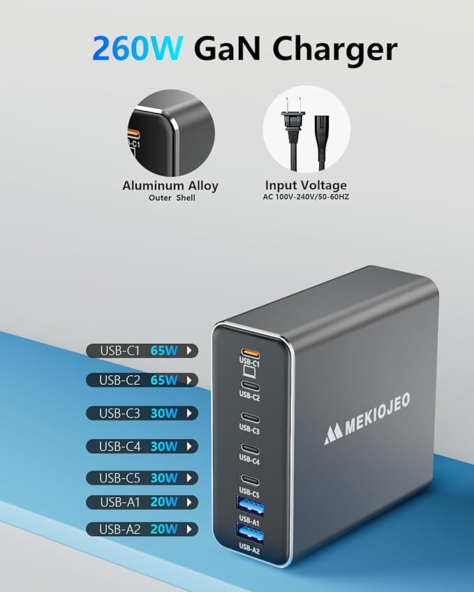 Aluminum Alloy 260W USB C Charger GaN Fast USB C Charging Station 7 Ports 65W Laptop Charger for MacBook Pro/Air/iPad Pro/iPhone (Gray)