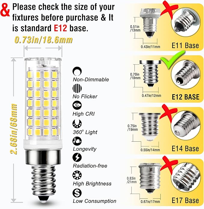 - New Upgraded Long Thread Base: Perfectly fit for all different e12 base light fixtures, you no need worry the base issue this time. E12 candelabra small base screw socket means the base diameter is 12mm, not e11, e17, e26