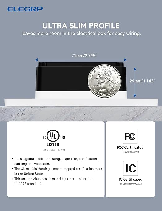 - ✅【Easy to Install】 Ultra slim profile leaves more room in the electrical box for easy wiring. Step-by-step installation instructions will help you finish the wiring process quickly and easily. Works in a single-pole setup only (Not 3 Way). Neutral Wire is Required. Only supports 2.4G network (NOT 5G). No Hub Required. Input power: 120V AC 60Hz. UL and FCC certificated.