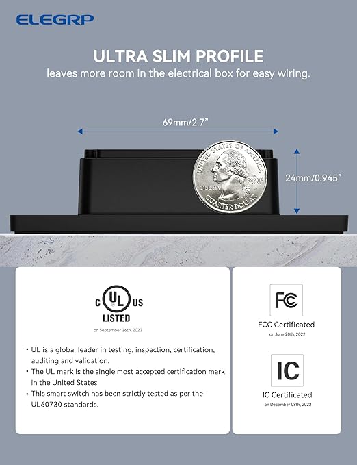 ELEGRP Smart Light Switch, 2.4GHz Wi-Fi Light Switch Compatible with Alexa & Google Assistant, Neutral Wire Required, APP Control and Timer Schedule, UL Certified, Single Pole/3 Way, Black, 1 Pack