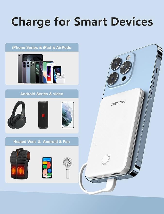 - Credit Card Size: They are the slimmest and the smallest of MIISSO portable chargers with cables, only 0.27lb(122g) and their body like a credit card. The lightweight design let you take it out without pressure. It's slim enough to put it in your pocket or in your handbag
